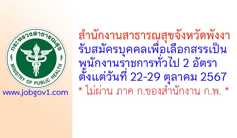 สำนักงานสาธารณสุขจังหวัดพังงา รับสมัครบุคคลเพื่อเลือกสรรเป็นพนักงานราชการทั่วไป 2 อัตรา ตั้งแต่วันที่ 22-29 ตุลาคม 2567