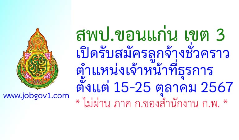 สพป.ขอนแก่น เขต 3 รับสมัครลูกจ้างชั่วคราว ตำแหน่งเจ้าหน้าที่ธุรการ ตั้งแต่วันที่ 15-25 ตุลาคม 2567