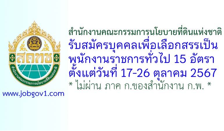 สำนักงานคณะกรรมการนโยบายที่ดินแห่งชาติ รับสมัครบุคคลเพื่อเลือกสรรเป็นพนักงานราชการทั่วไป 15 อัตรา ตั้งแต่วันที่ 17-26 ตุลาคม 2567