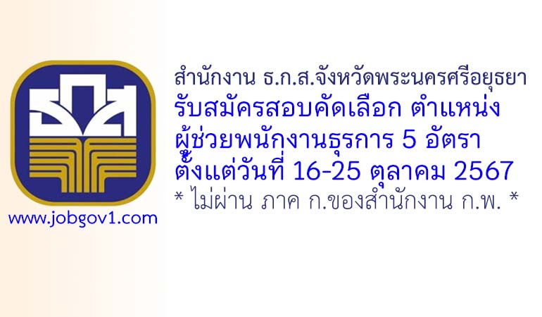 สำนักงาน ธ.ก.ส.จังหวัดพระนครศรีอยุธยา รับสมัครผู้ช่วยพนักงานธุรการ จำนวน 5 อัตรา ตั้งแต่วันที่ 16-25 ตุลาคม 2567