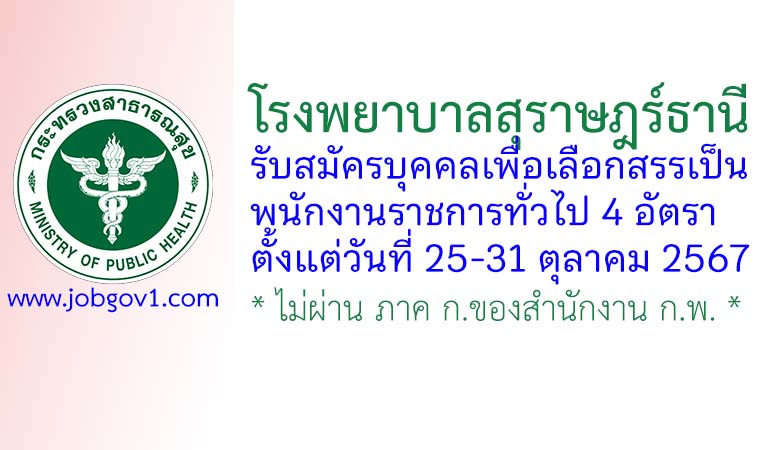โรงพยาบาลสุราษฎร์ธานี รับสมัครบุคคลเพื่อเลือกสรรเป็นพนักงานราชการทั่วไป 4 อัตรา ตั้งแต่วันที่ 25-31 ตุลาคม 2567