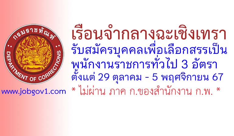 เรือนจำกลางฉะเชิงเทรา รับสมัครบุคคลเพื่อเลือกสรรเป็นพนักงานราชการทั่วไป 3 อัตรา ตั้งแต่ 29 ตุลาคม – 5 พฤศจิกายน 2567