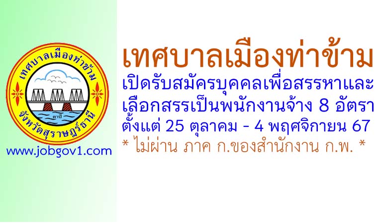 เทศบาลเมืองท่าข้าม รับสมัครบุคคลเพื่อสรรหาและเลือกสรรเป็นพนักงานจ้าง 8 อัตรา ตั้งแต่ 25 ตุลาคม – 4 พฤศจิกายน 2567