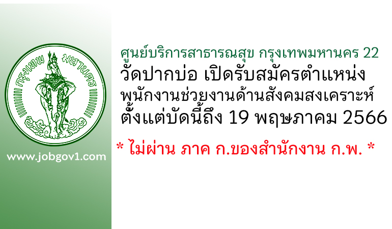 ศูนย์บริการสาธารณสุข กรุงเทพมหานคร 22 วัดปากบ่อ รับสมัครพนักงานช่วยงานด้านสังคมสงเคราะห์ ตั้่งแต่บัดนี้ถึง 19 พฤษภาคม 2566