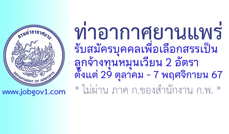 ท่าอากาศยานแพร่ รับสมัครสอบคัดเลือกเป็นลูกจ้างทุนหมุนเวียน 2 อัตรา ตั้งแต่ 29 ตุลาคม – 7 พฤศจิกายน 2567