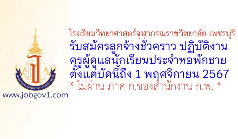 โรงเรียนวิทยาศาสตร์จุฬาภรณราชวิทยาลัย เพชรบุรี รับสมัครลูกจ้างชั่วคราว ปฏิบัติงานครูผู้ดูแลนักเรียนประจำหอพักชาย ตั้งแต่บัดนี้ถึง 1 พฤศจิกายน 2567