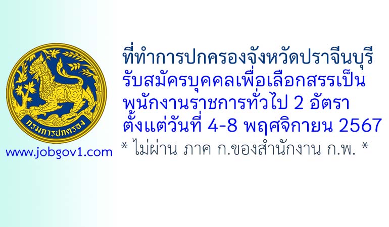 ที่ทำการปกครองจังหวัดปราจีนบุรี รับสมัครบุคคลเพื่อเลือกสรรเป็นพนักงานราชการทั่วไป 2 อัตรา ตั้งแต่วันที่ 4-8 พฤศจิกายน 2567