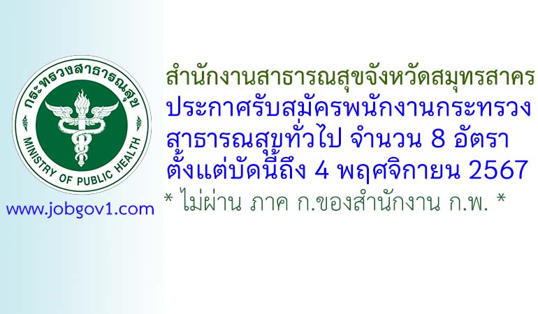 สำนักงานสาธารณสุขจังหวัดสมุทรสาคร รับสมัครพนักงานกระทรวงสาธารณสุขทั่วไป 8 อัตรา ตั้งแต่บัดนี้ถึง 4 พฤศจิกายน 2567