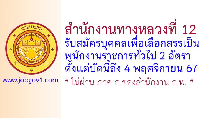 สำนักงานทางหลวงที่ 12 รับสมัครบุคคลเพื่อเลือกสรรเป็นพนักงานราชการทั่วไป 2 อัตรา ตั้งแต่บัดนี้ถึง 4 พฤศจิกายน 2567