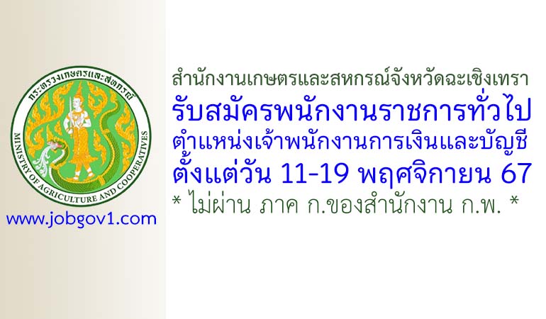 สำนักงานเกษตรและสหกรณ์จังหวัดฉะเชิงเทรา รับสมัครพนักงานราชการทั่วไป ตำแหน่งเจ้าพนักงานการเงินและบัญชี ตั้งแต่วันที่ 11-19 พฤศจิกายน 2567