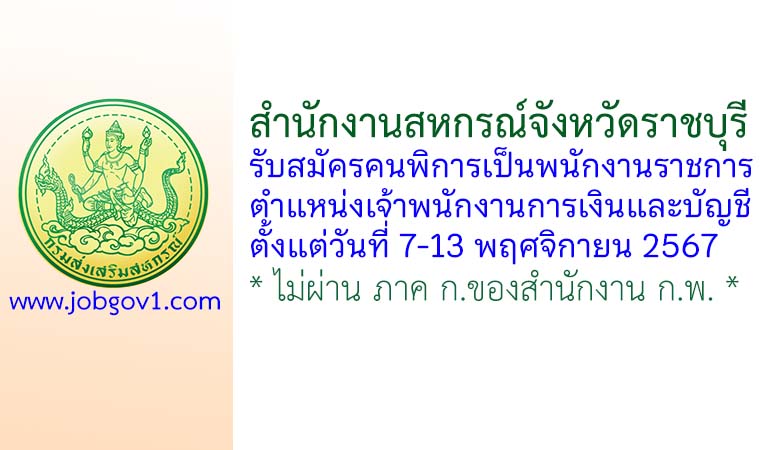 สำนักงานสหกรณ์จังหวัดราชบุรี รับสมัครคนพิการเป็นพนักงานราชการทั่วไป ตำแหน่งเจ้าพนักงานการเงินและบัญชี ตั้งแต่วันที่ 7-13 พฤศจิกายน 2567