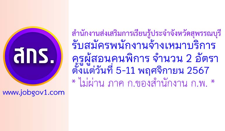 สำนักงานส่งเสริมการเรียนรู้ประจำจังหวัดสุพรรณบุรี รับสมัครพนักงานจ้างเหมาบริการ ตำแหน่งครูผู้สอนคนพิการ จำนวน 2 อัตรา ตั้งแต่วันที่ 5-11 พฤศจิกายน 2567