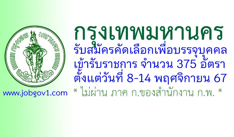 กรุงเทพมหานคร รับสมัครคัดเลือกเพื่อบรรจุบุคคลเข้ารับราชการ 375 อัตรา ตั้งแต่วันที่ 8-14 พฤศจิกายน 2567