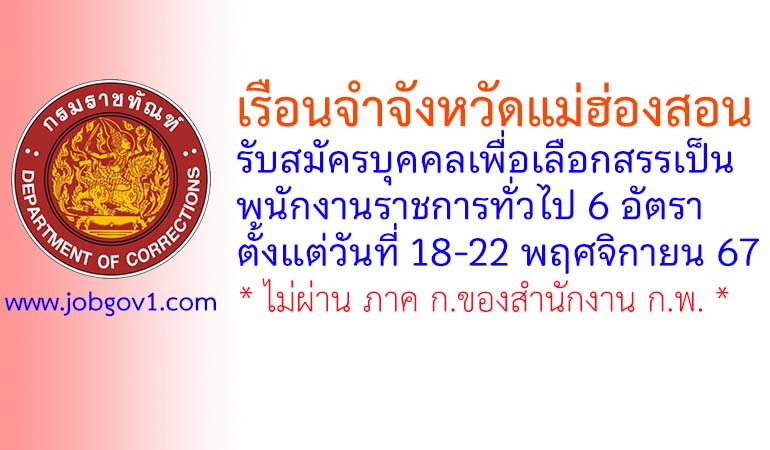 เรือนจำจังหวัดแม่ฮ่องสอน รับสมัครบุคคลเพื่อเลือกสรรเป็นพนักงานราชการทั่วไป 6 อัตรา ตั้งแต่วันที่ 18-22 พฤศจิกายน 2567