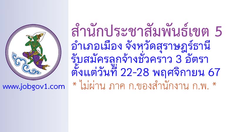 สำนักประชาสัมพันธ์เขต 5 รับสมัครลูกจ้างชั่วคราว 3 อัตรา ตั้งแต่วันที่ 22-28 พฤศจิกายน 2567
