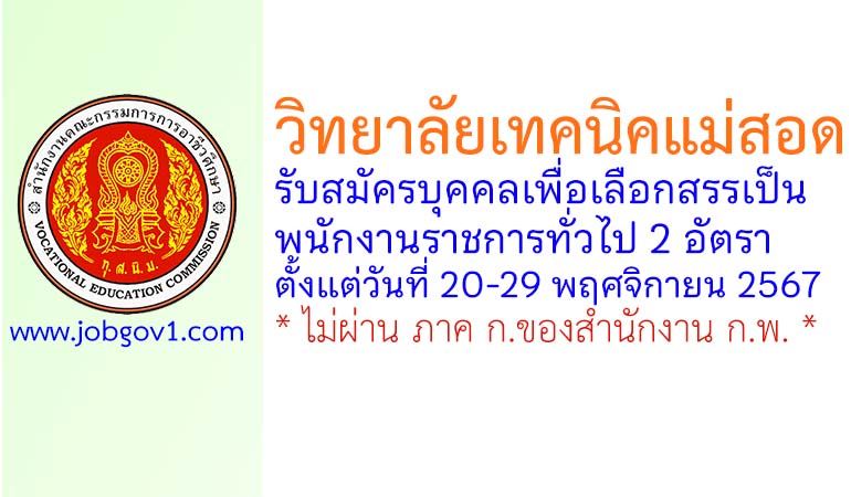 วิทยาลัยเทคนิคแม่สอด รับสมัครบุคคลเพื่อเลือกสรรเป็นพนักงานราชการทั่วไป 2 อัตรา ตั้งแต่วันที่ 20-29 พฤศจิกายน 2567