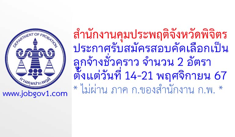 สำนักงานคุมประพฤติจังหวัดพิจิตร รับสมัครสอบคัดเลือกเป็นลูกจ้างชั่วคราว 2 อัตรา ตั้งแต่วันที่ 14-21 พฤศจิกายน 2567