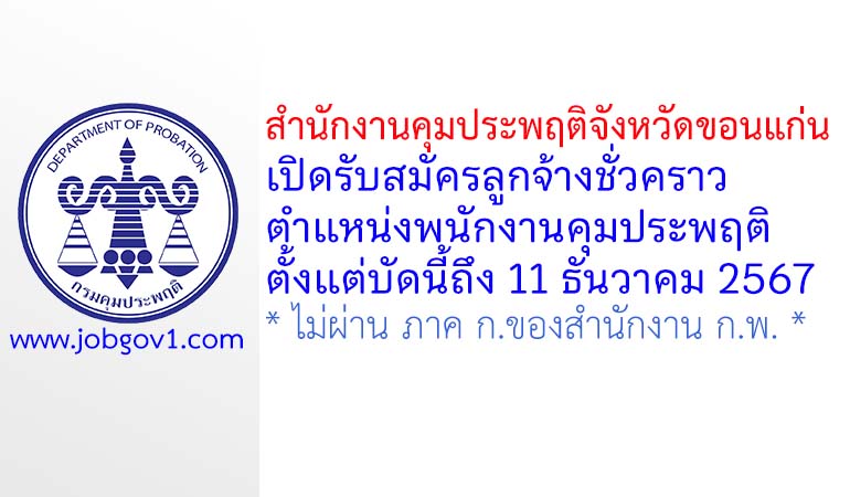 สำนักงานคุมประพฤติจังหวัดขอนแก่น รับสมัครลูกจ้างชั่วคราว ตำแหน่งพนักงานคุมประพฤติ ตั้งแต่บัดนี้ถึง 11 ธันวาคม 2567
