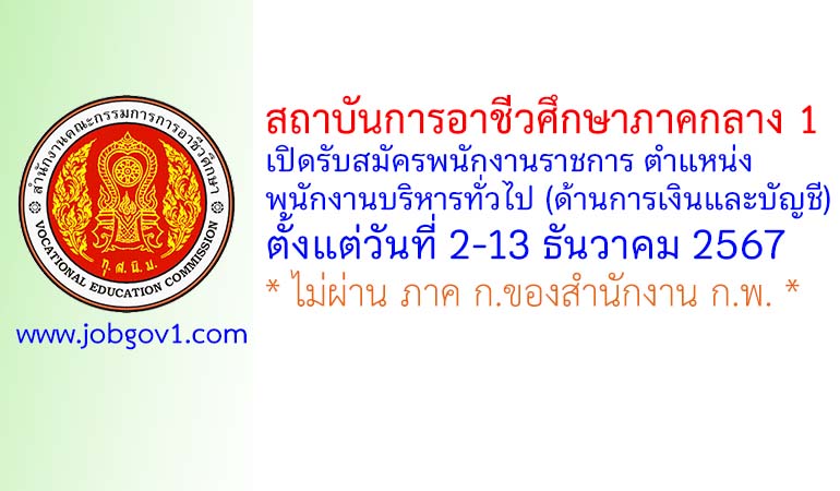 สถาบันการอาชีวศึกษาภาคกลาง 1 รับสมัครพนักงานราชการทั่วไป ตำแหน่งพนักงานบริหารทั่วไป (ด้านการเงินและบัญชี) ตั้งแต่วันที่ 2-13 ธันวาคม 2567