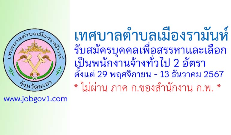 เทศบาลตำบลเมืองรามันห์ รับสมัครบุคคลเพื่อสรรหาและเลือกเป็นพนักงานจ้างทั่วไป 2 อัตรา ตั้งแต่ 29 พฤศจิกายน – 13 ธันวาคม 2567