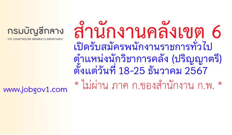 ประกาศกรมบัญชีกลาง เรื่อง รับสมัครบุคคลเพื่อเลือกสรรเป็นพนักงานราชการทั่วไป (สำนักงานคลังเขต 6 และสำนักงานคลังจังหวัดในเขตพื้นที่) กรณีรับบุคคลทั่วไปเข้าทำงาน ในตำแหน่งนักวิชาการคลัง (ปริญญาตรี)