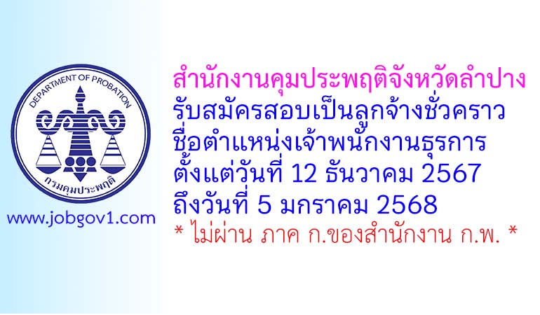 สำนักงานคุมประพฤติจังหวัดลำปาง รับสมัครลูกจ้างชั่วคราว ตำแหน่งเจ้าพนักงานธุรการ ตั้งแต่วันที่ 12 ธันวาคม 2567 – 5 มกราคม 2568