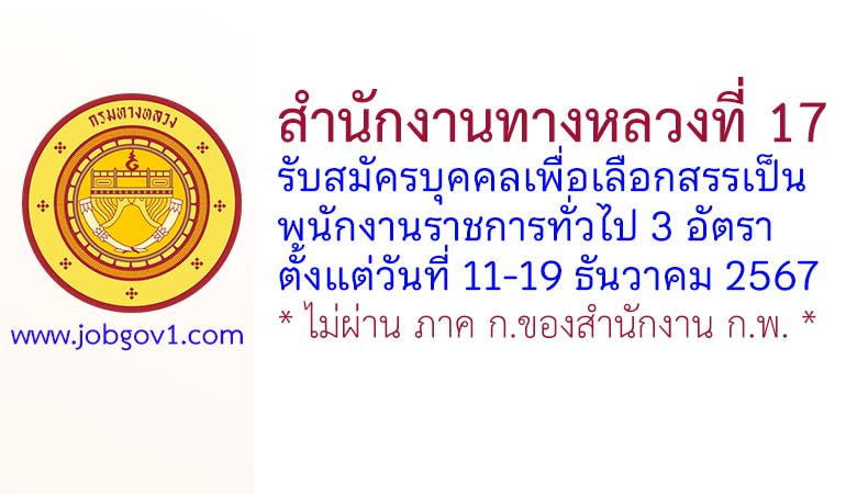 สำนักงานทางหลวงที่ 17 รับสมัครบุคคลเพื่อเลือกสรรเป็นพนักงานราชการทั่วไป 3 อัตรา ตั้งแต่วันที่ 11-19 ธันวาคม 2567