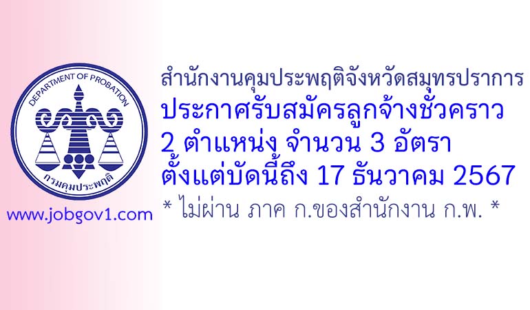 สำนักงานคุมประพฤติจังหวัดสมุทรปราการ รับสมัครลูกจ้างชั่วคราว 3 อัตรา ตั้งแต่บัดนี้ถึง 17 ธันวาคม 2567