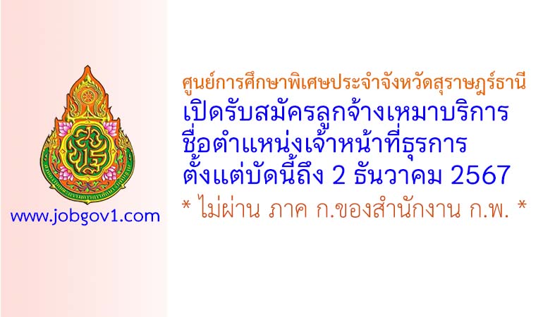ศูนย์การศึกษาพิเศษประจำจังหวัดสุราษฎร์ธานี รับสมัครลูกจ้างเหมาบริการ ตำแหน่งเจ้าหน้าที่ธุรการ ตั้งแต่บัดนี้ถึง 2 ธันวาคม 2567