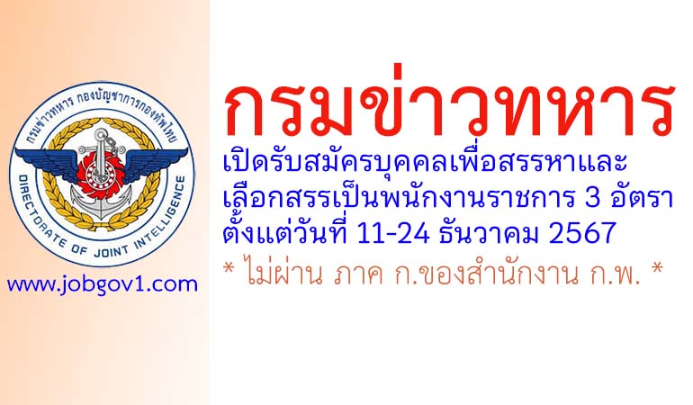กรมข่าวทหาร รับสมัครบุคคลเพื่อสรรหาและเลือกสรรเป็นพนักงานราชการ 3 อัตรา ตั้งแต่วันที่ 11-24 ธันวาคม 2567