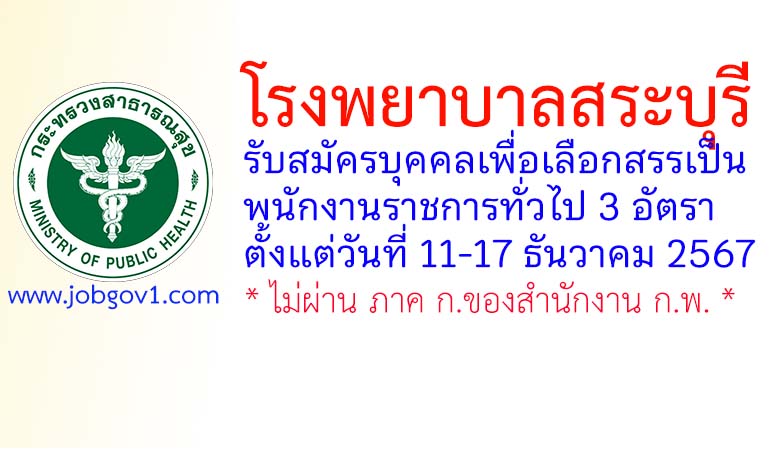 โรงพยาบาลสระบุรี รับสมัครบุคคลเพื่อเลือกสรรเป็นพนักงานราชการทั่วไป 3 อัตรา ตั้งแต่วันที่ 11-17 ธันวาคม 2567