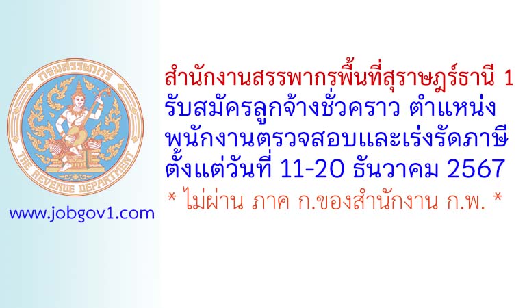 สำนักงานสรรพากรพื้นที่สุราษฎร์ธานี 1 รับสมัครลูกจ้างชั่วคราว ตำแหน่งพนักงานตรวจสอบและเร่งรัดภาษี ตั้งแต่วันที่ 11-20 ธันวาคม 2567