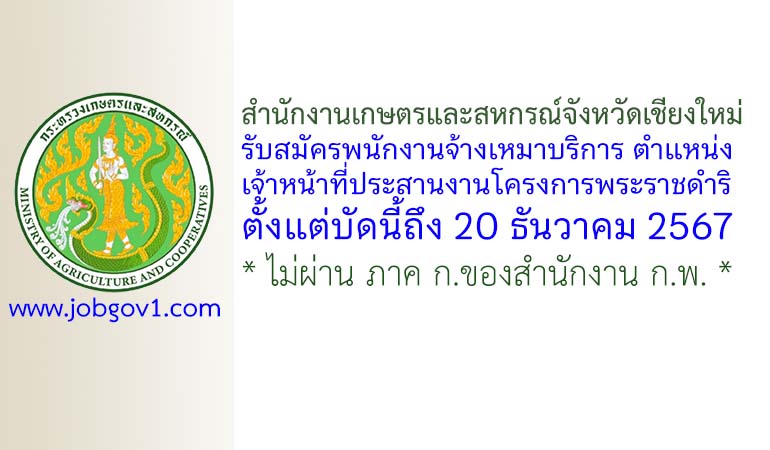 สำนักงานเกษตรและสหกรณ์จังหวัดเชียงใหม่ รับสมัครพนักงานจ้างเหมาบริการ ตำแหน่งเจ้าหน้าที่ประสานงานโครงการพระราชดำริ ตั้งแต่บัดนี้ถึง 20 ธันวาคม 2567
