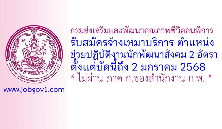 กรมส่งเสริมและพัฒนาคุณภาพชีวิตคนพิการ รับสมัครจ้างเหมาบริการ ตำแหน่งช่วยปฏิบัติงานนักพัฒนาสังคม 2 อัตรา ตั้งแต่บัดนี้ถึง 2 มกราคม 2568