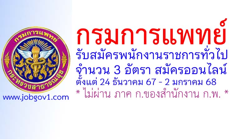 กรมการแพทย์ รับสมัครบุคคลเพื่อเลือกสรรเป็นพนักงานราชการทั่วไป 3 อัตรา ตั้งแต่ 24 ธันวาคม 2567 – 2 มกราคม 2568