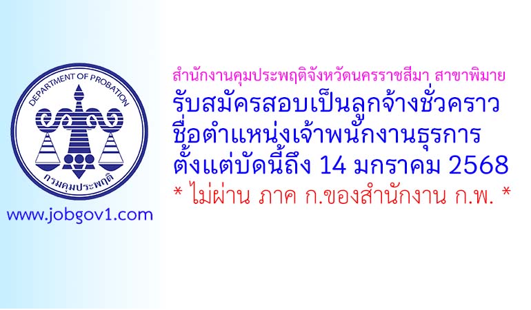 สำนักงานคุมประพฤติจังหวัดนครราชสีมา สาขาพิมาย รับสมัครลูกจ้างชั่วคราว ตำแหน่งเจ้าพนักงานธุรการ ตั้งแต่บัดนี้ถึง 14 มกราคม 2568