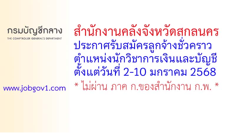ประกาศสำนักงานคลังจังหวัดสกลนคร เรื่อง รับสมัครคัดเลือกเป็นลูกจ้างชั่วคราวรายเดือน ตำแหน่งนักวิชาการเงินและบัญชี (ปริญญาตรี)