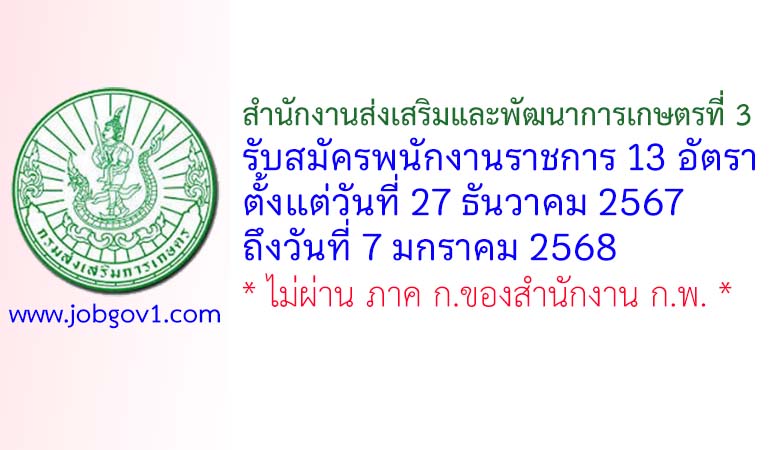 สำนักงานส่งเสริมและพัฒนาการเกษตรที่ 3 รับสมัครบุคคลเพื่อเลือกสรรเป็นพนักงานราชการทั่วไป 13 อัตรา ตั้งแต่วันที่ 27 ธันวาคม 2567 ถึงวันที่ 7 มกราคม 2568