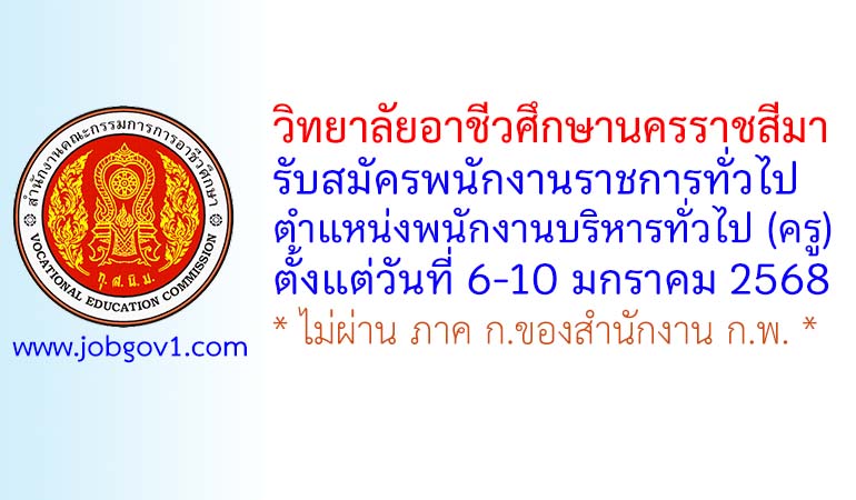 วิทยาลัยอาชีวศึกษานครราชสีมา รับสมัครพนักงานราชการทั่วไป ตำแหน่งพนักงานบริหารทั่วไป (ครู) ตั้งแต่วันที่ 6-10 มกราคม 2568