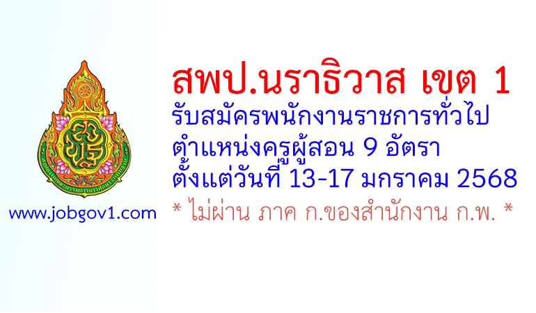 สพป.นราธิวาส เขต 1 รับสมัครพนักงานราชการทั่วไป ตำแหน่งครูผู้สอน 9 อัตรา ตั้งแต่วันที่ 13-17 มกราคม 2568