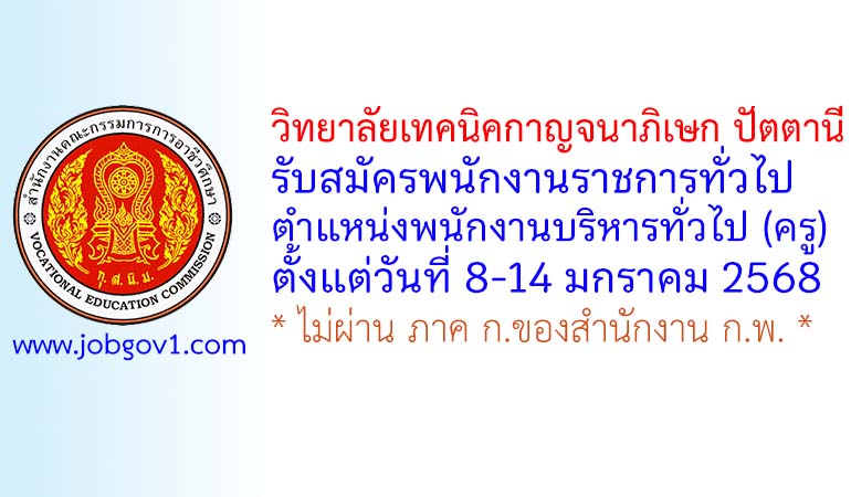 วิทยาลัยเทคนิคกาญจนาภิเษก ปัตตานี รับสมัครพนักงานราชการทั่วไป ตำแหน่งพนักงานบริหารทั่วไป (ครู) ตั้งแต่วันที่ 8-14 มกราคม 2568