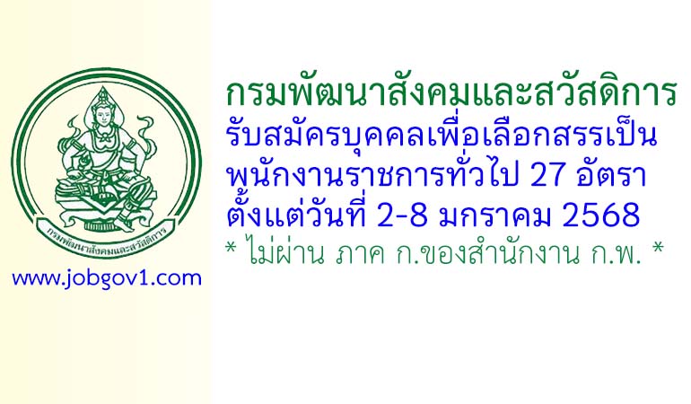 กรมพัฒนาสังคมและสวัสดิการ รับสมัครบุคคลเพื่อเลือกสรรเป็นพนักงานราชการทั่วไป 27 อัตรา ตั้งแต่วันที่ 2-8 มกราคม 2568