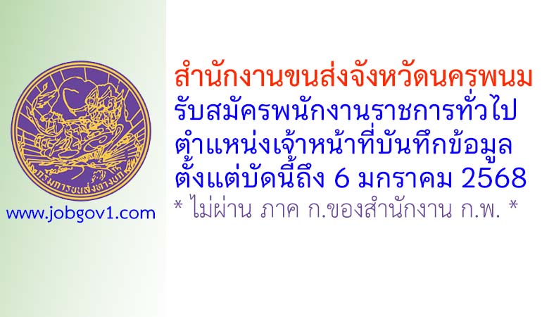 สำนักงานขนส่งจังหวัดนครพนม รับสมัครพนักงานราชการทั่วไป ตำแหน่งเจ้าหน้าที่บันทึกข้อมูล ตั้งแต่บัดนี้ถึง 6 มกราคม 2568