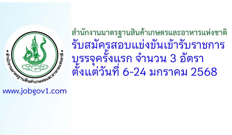 สำนักงานมาตรฐานสินค้าเกษตรและอาหารแห่งชาติ รับสมัครสอบแข่งขันเข้ารับราชการ บรรจุครั้งแรก 3 อัตรา ตั้งแต่วันที่ 6-24 มกราคม 2568