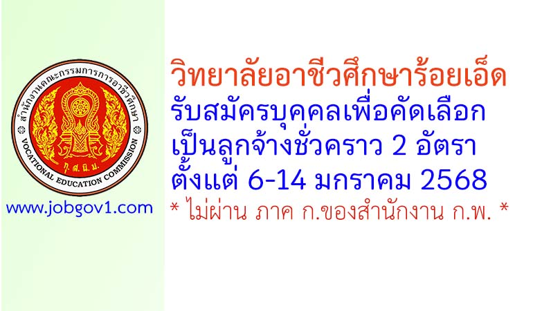 วิทยาลัยอาชีวศึกษาร้อยเอ็ด รับสมัครลูกจ้างชั่วคราว 2 อัตรา ตั้งแต่วันที่ 6-14 มกราคม 2568