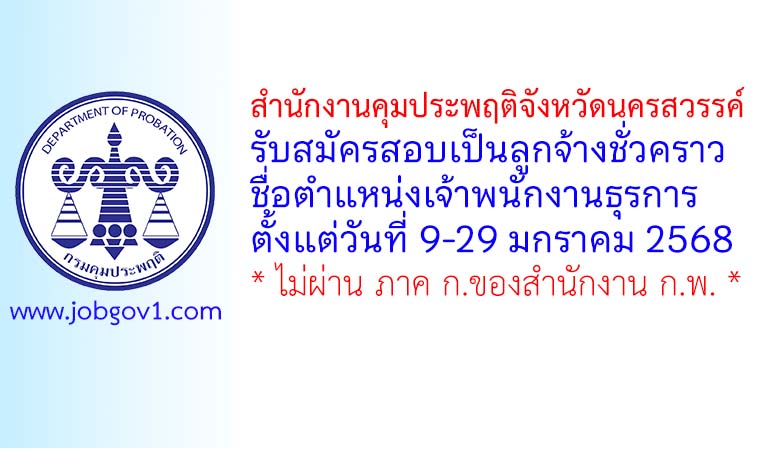 สำนักงานคุมประพฤติจังหวัดนครสวรรค์ รับสมัครลูกจ้างชั่วคราว ตำแหน่งเจ้าพนักงานธุรการ ตั้งแต่วันที่ 9-29 มกราคม 2568