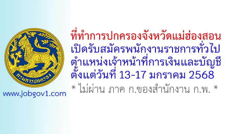 ที่ทำการปกครองจังหวัดแม่ฮ่องสอน รับสมัครพนักงานราชการทั่วไป ตำแหน่งเจ้าหน้าที่การเงินและบัญชี ตั้งแต่วันที่ 13-17 มกราคม 2568