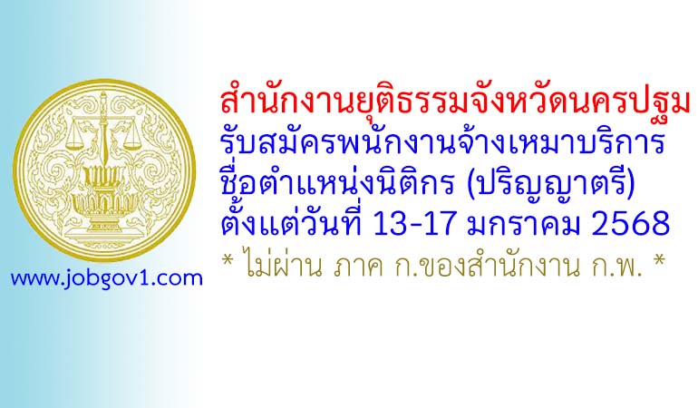 สำนักงานยุติธรรมจังหวัดนครปฐม รับสมัครพนักงานจ้างเหมาบริการ ตำแหน่งนิติกร (ปริญญาตรี) ตั้งแต่วันที่ 13-17 มกราคม 2568