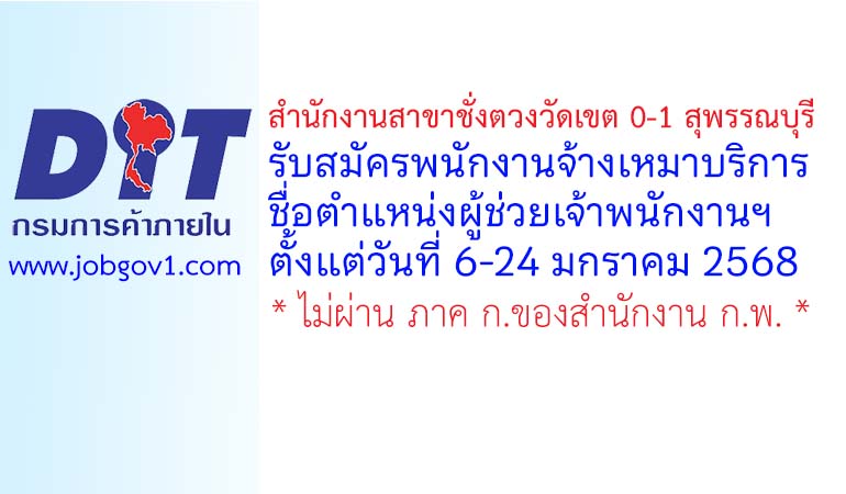 ประกาศสำนักงานสาขาชั่งตวงวัดเขต 0-1 สุพรรณบุรี เรื่อง รับสมัครบุคคลเพื่อคัดเลือกเป็นพนักงานจ้างเหมาบุคลากรภายนอก (ตำแหน่ง ผู้ช่วยเจ้าพนักงานตาม พ.ร.บ.ว่าด้วยราคาสินค้าและบริการฯ) ปีงบประมาณ 2568