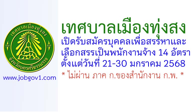 เทศบาลเมืองทุ่งสง รับสมัครบุคคลเพื่อสรรหาและเลือกสรรเป็นพนักงานจ้าง 14 อัตรา ตั้งแต่วันที่ 21-30 มกราคม 2568